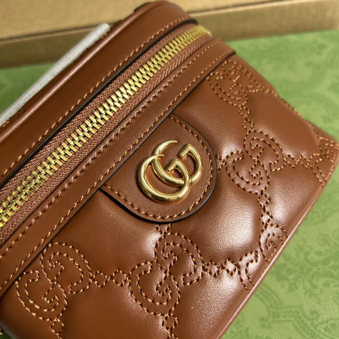 . Equipped with a full set of specialty green packaging GG Matelassmini handbags, quilted leather interprets the brand's iconic materials with a soft texture. The textured geometric patterns vividly depict various small leather accessories, including this black mini handbag. The front is adorned with dual G accessories, injecting brand identity into the entire design. Hide detailed information, brown GG Matelasss leather, double G gold adjustable accessories, 1 open pocket and hook buckle inside, handle 1.5cm high, shoulder strap 50cm high, zipper closure .Model 723770 .Size 16 W x 10.5 H x 5 cm DColor brown embossed G full leather.