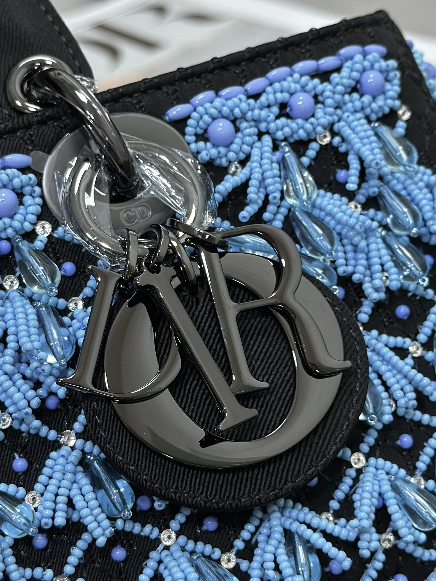 Lady DJoy's new embroidered water drop blue bead is a brand new item of this season, fully demonstrating Dior's profound insight into elegance and beauty. Handcrafted using silk fabric and embroidered with beads to create iconic patterns, the stylish and elegant design is timeless. Paired with gun colored decorative metal D.I.O.R. pendants, embellished with beaded embroidery throughout, showcasing an elegant temperament. Paired with detachable chain shoulder straps and adjustable and detachable leather shoulder straps, it can be carried or slung, making it an ideal companion for daily styling. Detachable chain shoulder strap, detachable and adjustable leather shoulder strap. Size 26 x 13.5 x 5 cm, model M0540, exclusive physical photos for delivery, full set of original packaging, white gift box, nationally unified 80