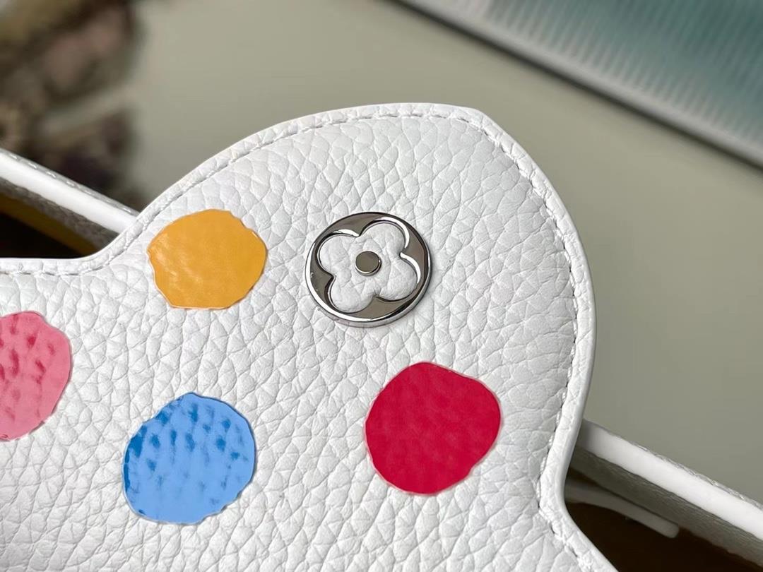 Top level original sheet M21637 48865 white spell color dot small size x Yayoi Kusama cooperation series reinterprets traditional design from an artistic perspective This LV x YK Capucines handbag turns the psychedelic waves described by the artist into colorful prints presented in the soft Taurillon leather zipper inner bag through silk screen printing. The pumpkin shaped zipper head indicates another classic image in Yayoi Kusama's works Size 27 18 9cm E681300