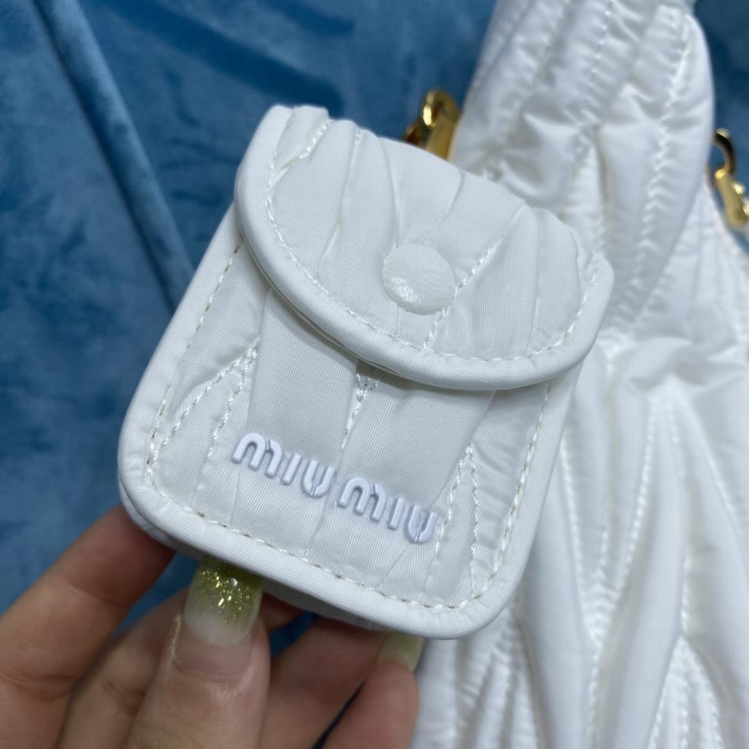 M Family's New Underarm BagThe 5BC108 MiuMiu new bag MiuWander handbag is made of environment-friendly nylon. The yarn is made of purified marine plastics, fishing nets and textile fiber recyclables, which conveys the concept of environmental protection and sustainability. The soft and plump body is made of Matelasse, honing and sewing. It is decorated with metal lettering logos in the same color system. The side detachable pocket can be used to store small objects such as Airpods. The colors are very rich, black, white, mint green, Tartrazine, cherry blossom powder, 6 colors of interstellar blue, size 28X14X9, with original packaging 880087(professional luxury fashion brand agent business)